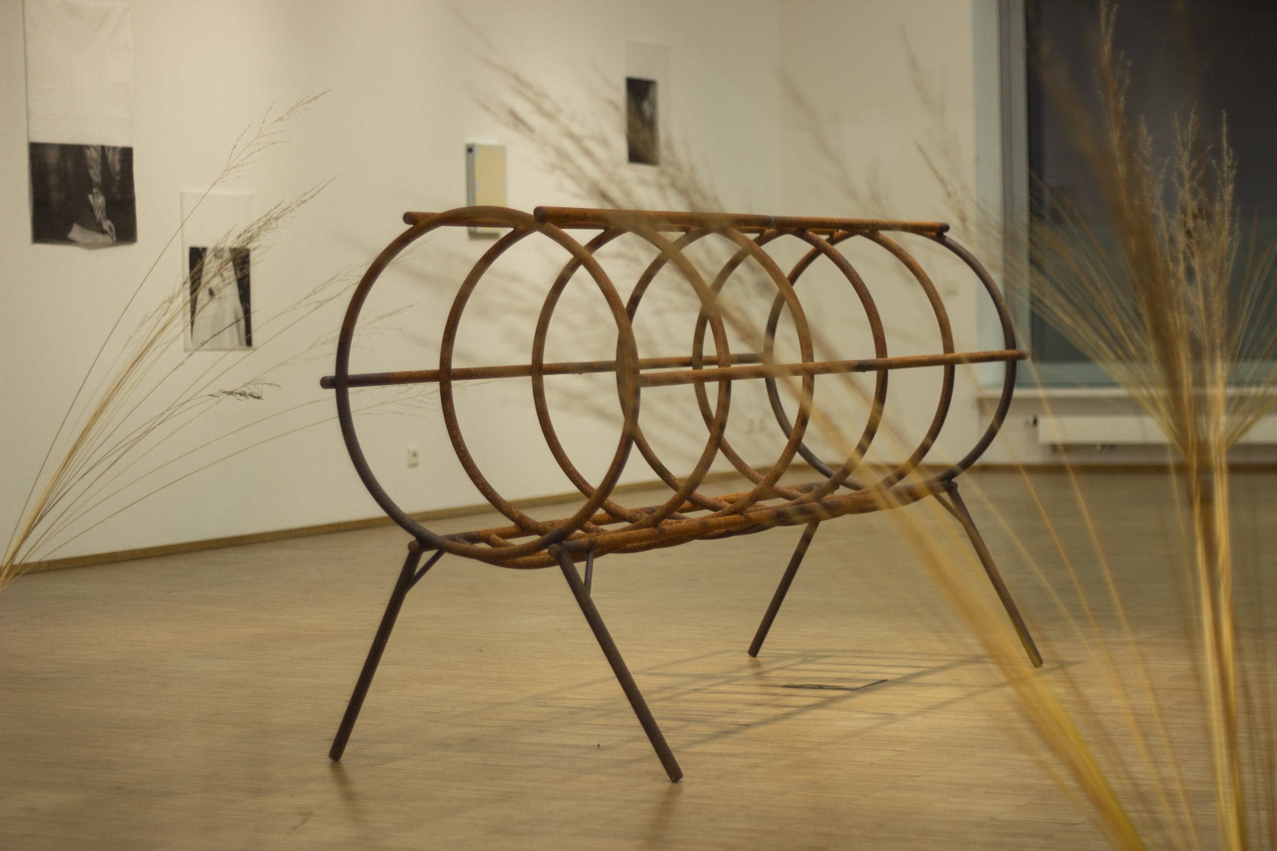 Patiemment, régulièrement, elle a travaillé le métal lisse avec de l’eau salée. La répétition de son geste, touchant au rituel de soin, a accéléré le développement de la rouille. La décrépitude se poursuit maintenant seule, couleurs et teintes soumises aux circonstances puisqu’aucun vernis n’est venu stopper le processus de vieillissement.