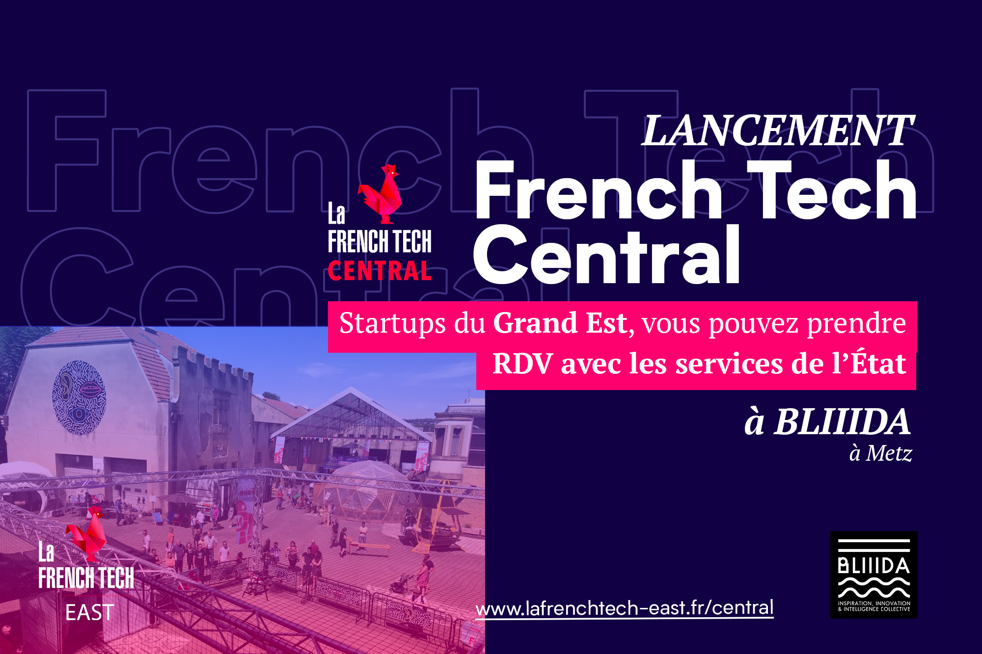 - En tant que bâtiment totem French Tech East, BLIIIDA prend part au lancement de la French Tech Central : le tiers lieu accueille les rendez-vous des startups avec les acteurs publics dans le cadre de ce programme. Objectif : un accès privilégié aux administrations, pour accompagner les startups dans leur développement. La plateforme est en ligne.
