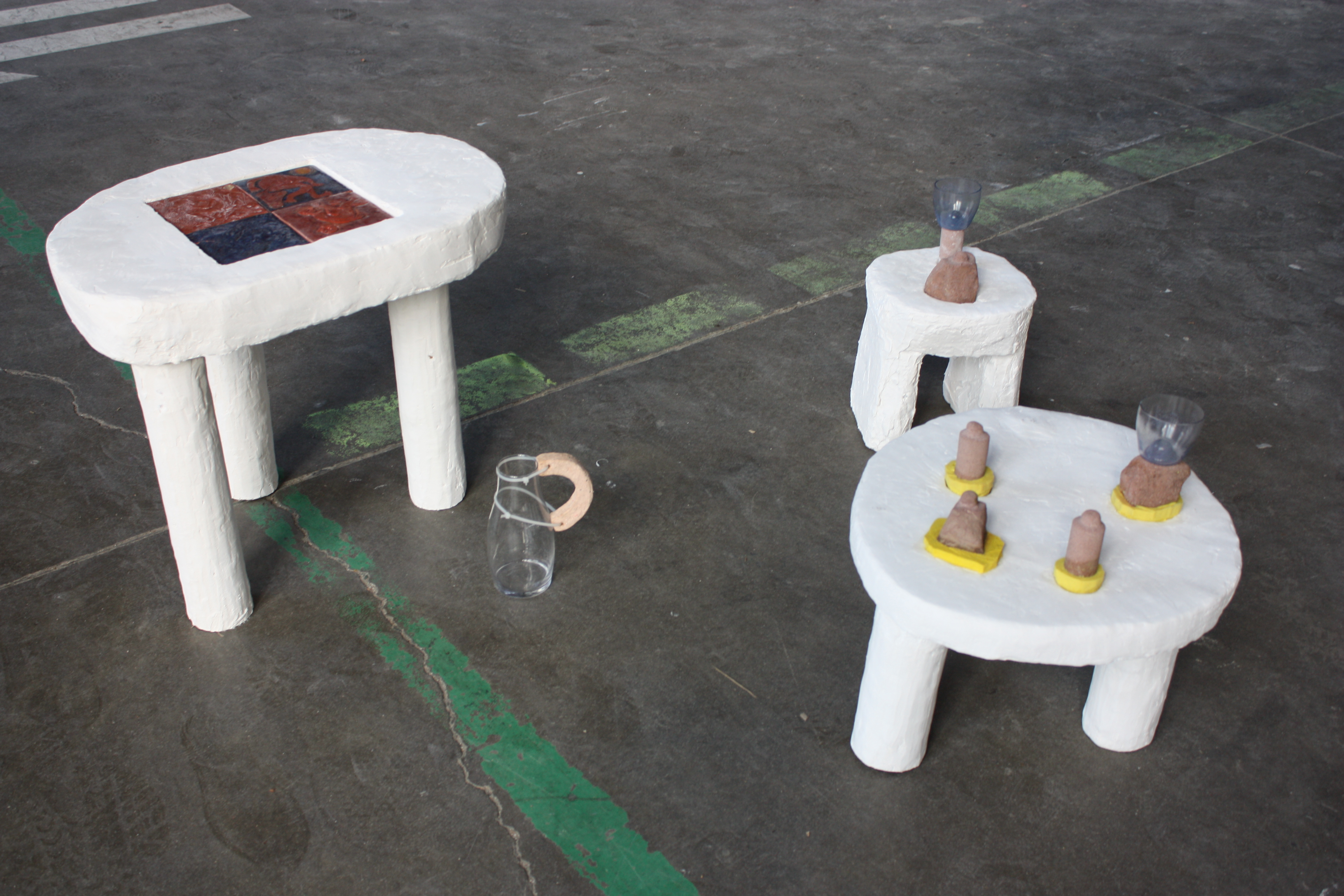 Étudiante en master aux beaux-arts de Metz, je m’intéresse à la relation que l’on entretient avec son environnement à travers la sculpture et depuis peu par la nourriture. Je fabrique pour mon projet de diplôme un dispositif total composé d’objets. Ils sont destinés à être manipulés lors de performance culinaire participative, où j’offre un moment pour boire et manger. Je développe des formes autour de l’art de la table, plus particulièrement du contenant. Ces formes sont des objets hybrides entre des emprunts à des références archéologiques ou populaires, et par l’utilisation de matières industrielles brutes. Installé dans un espace, l’ensemble crée un univers entre sculpture et objet utilitaire, destiné à être investi lors d’une occasion.