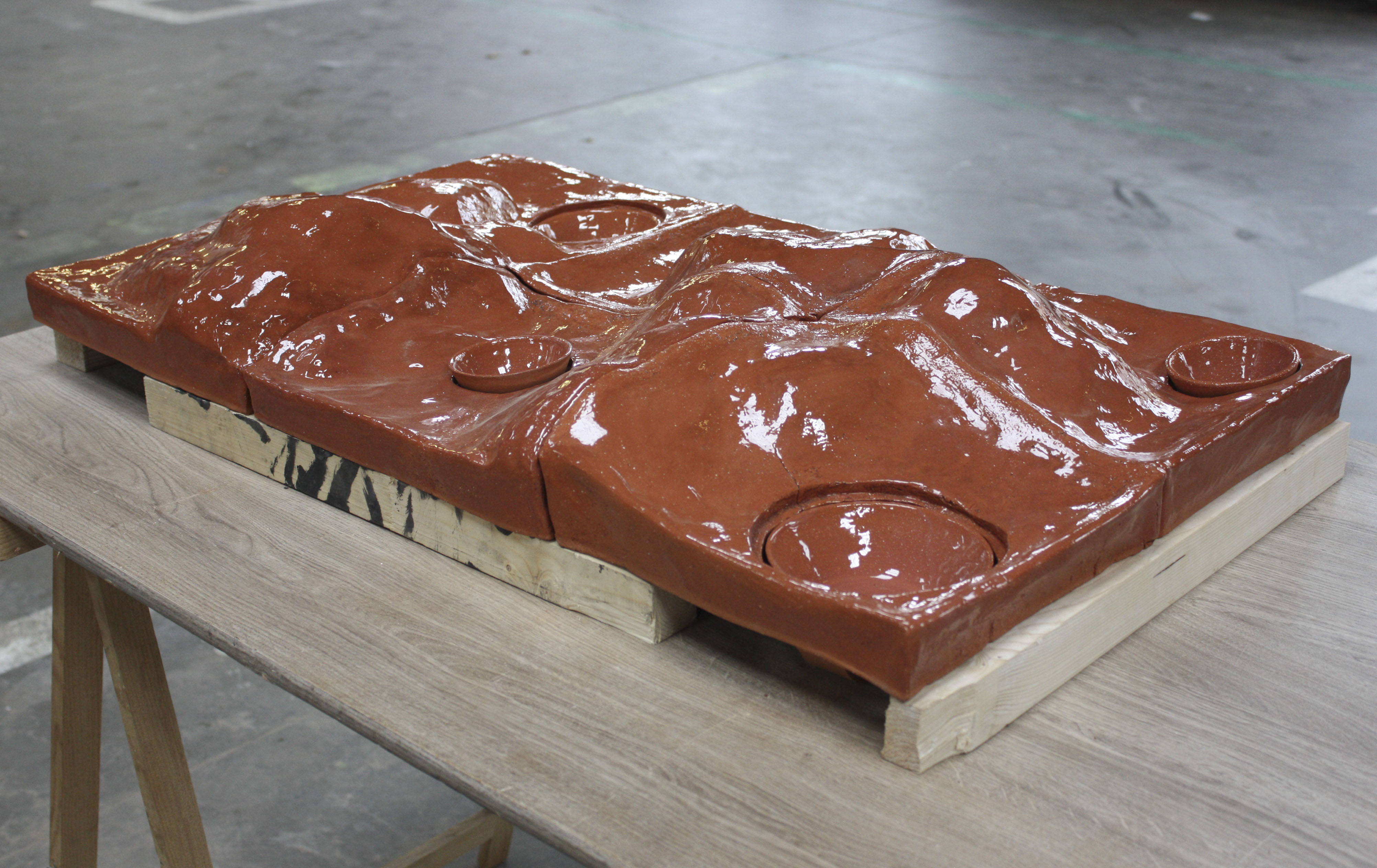 Inspiré du paysage de la côte de Delme, j’ai réalisé des modules en formes de montagnes, support d’une prochaine installation culinaire. La céramique est une technique de travail de l’argile qui une fois émaillée se prête à l’alimentaire. Ces formes de montagnes, d’abord taillées dans du polystyrène puis recouvertes de plaque d’argile, composent un paysage pouvant contenir des bols, destinés à recevoir des mets.